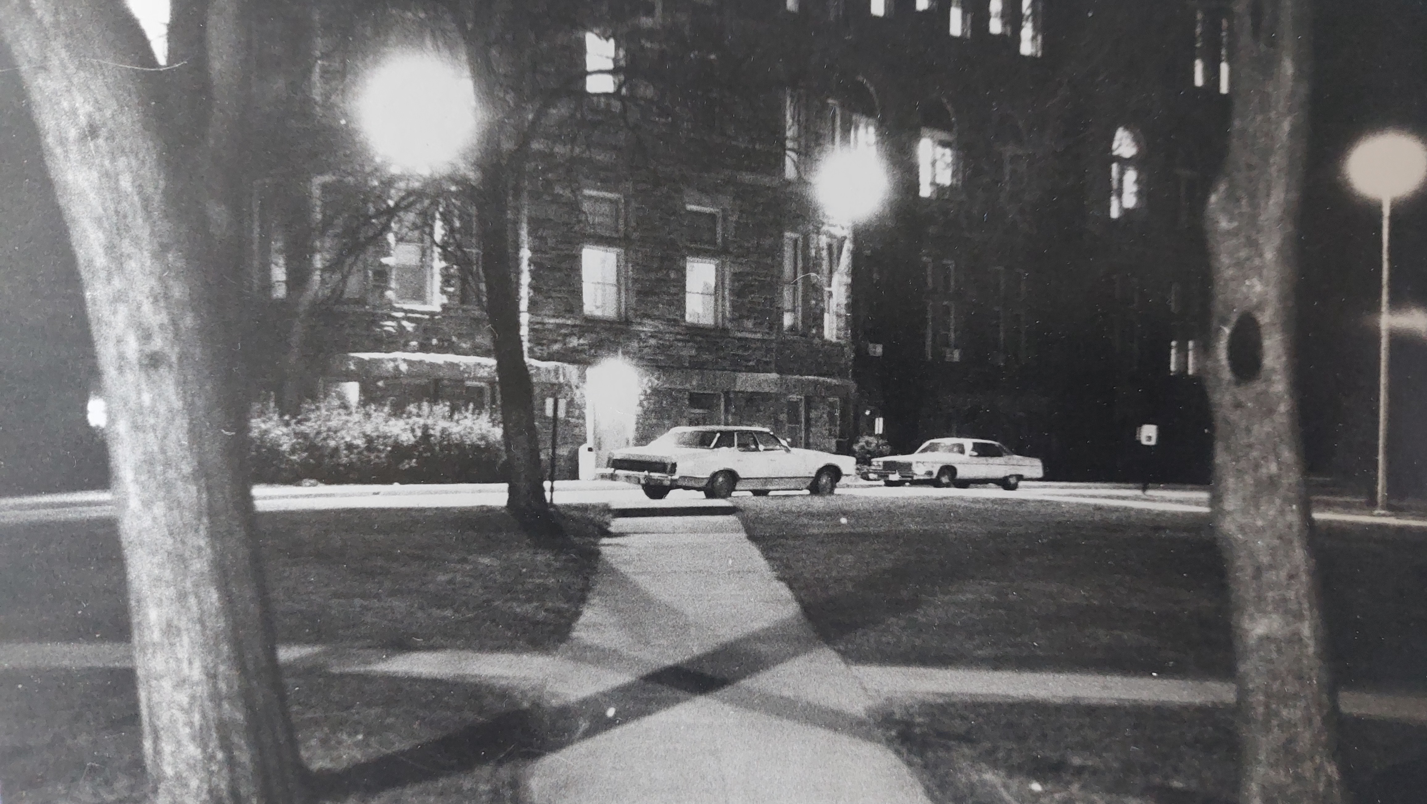 The images on this page were taken, developed, and printed by me circa 1981-82 for a college photography class. Several were displayed as part of a show in the campus library. May have used infrared film for some of the night shots. Check out those late 70s/early 80s cars. And, yeah, that’s me looking pretty studly/punk in shades and my varsity jacket (track and field conference champions), with a full shock of hair.
